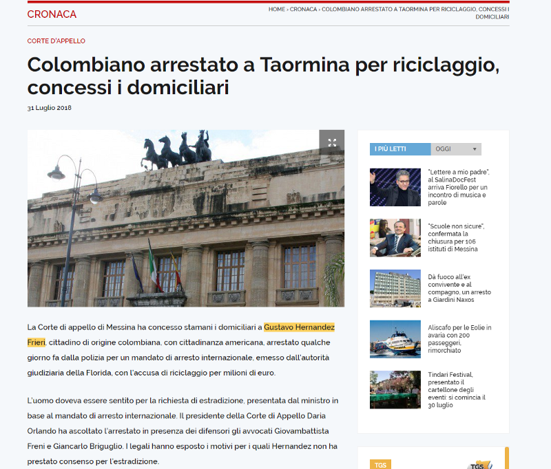 Diarios de Sicilia reportan el arresto domiciliario de Hernández Frieri