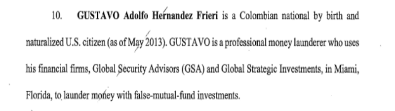 El comentario alude a la extrema discreción que dice tener Gustavo Hernández Frieri, un “lavador de dinero profesional” como le describe la Fiscalía de Estados Unidos en la acusación. El colombiano garantiza confidencialidad y sigilo en cada una de las operaciones que ejecuta para sus “clientes”, y claro, nada de fiestas o cocteles.
