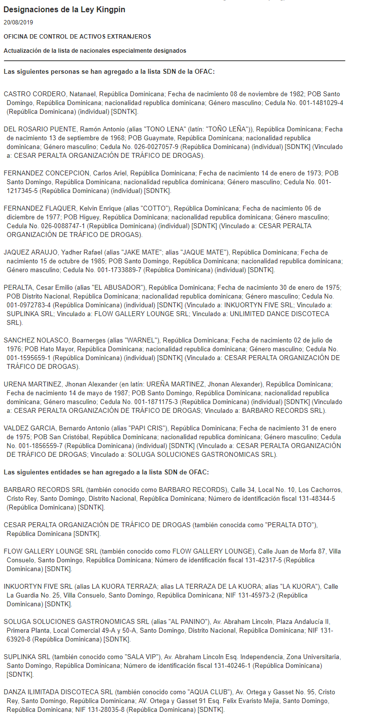 A mediodía de este martes, la Oficina de Control de Activos Extranjeros del Departamento del Tesoro de los Estados Unidos (Ofac) identificó al ciudadano dominicano César Emilio Peralta y a la organización de narcotráfico de Peralta (Peralta DTO) como traficantes de narcóticos extranjerosde conformidad con la Ley de Designación de Kingpin de Narcóticos Extranjeros (Ley Kingpin ). Además de Peralta, la Ofac designó a ocho ciudadanos dominicanos adicionales por brindar apoyo material  o actuar para o en nombre de Cesar Emilio Peralta y su organización. La Ofac también designó seis entidades en Santo Domingo, República Dominicana, incluidas varias discotecas propiedad o controladas por Cesar Emilio Peralta, reza el comunicado oficial.