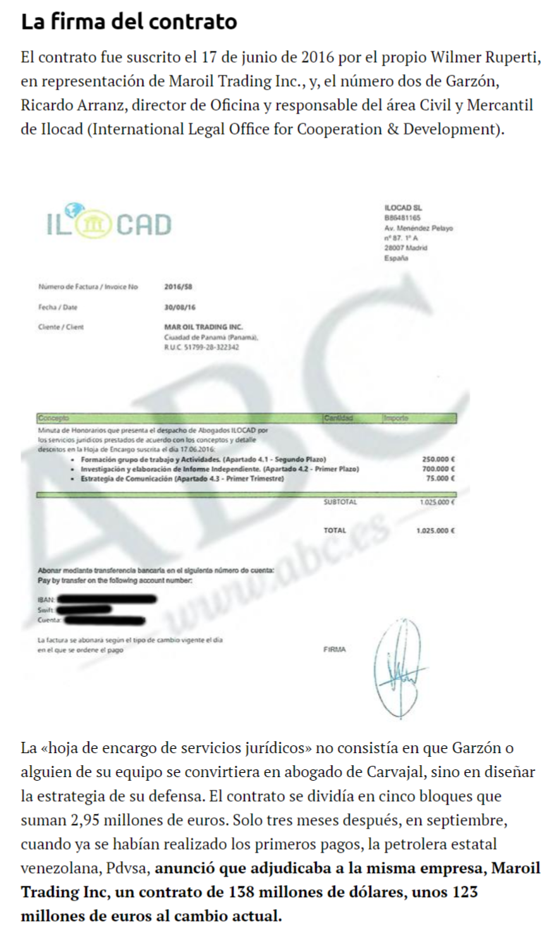 Tres años después, el diario español ABC revela que fue con Wilmer Ruperti, quien representa un importante sector del chavismo, con quien el bufete de Garzón habría firmado un millonario contrato el 17 de junio de 2016, un par de meses antes de la fecha de la consulta hecha al ex magistrado español por este caso.