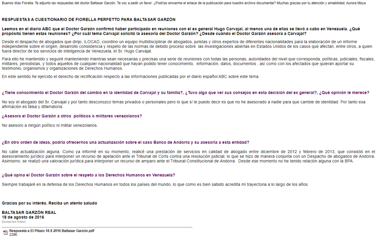 El bufete de Baltasar Garzón respondió a la consulta hecha por esta periodista el 18 de agosto de 2016, para despejar dudas sobre este y otros temas. Dijo desconocer las actividades que pueda haber realizado Carvajal. “No soy el abogado del señor Carvajal y por lo tanto desconozco temas privados o personales; no he asesorado a nadie para que cambie de identidad, por lo que esa afirmación es falsa y difamatoria”.
