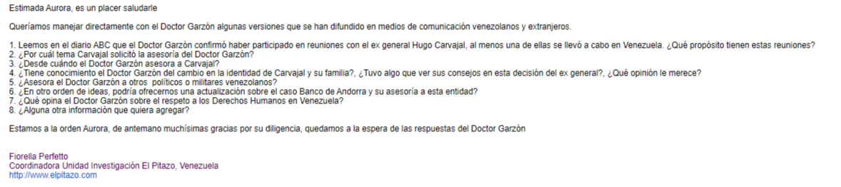 Esta periodista le pidió una explicación más amplia al respecto. “Ni el señor Baltasar Garzón, ni el despacho de abogados que dirige han sido contratados por el gobierno de Venezuela u otro sector del chavismo. El informe que coordina el señor Baltasar Garzón, versa sobre determinados y precisos procedimientos en Estados Unidos absolutamente ajenos a los sobrinos del presidente de Venezuela, el señor Nicolás Maduro”.