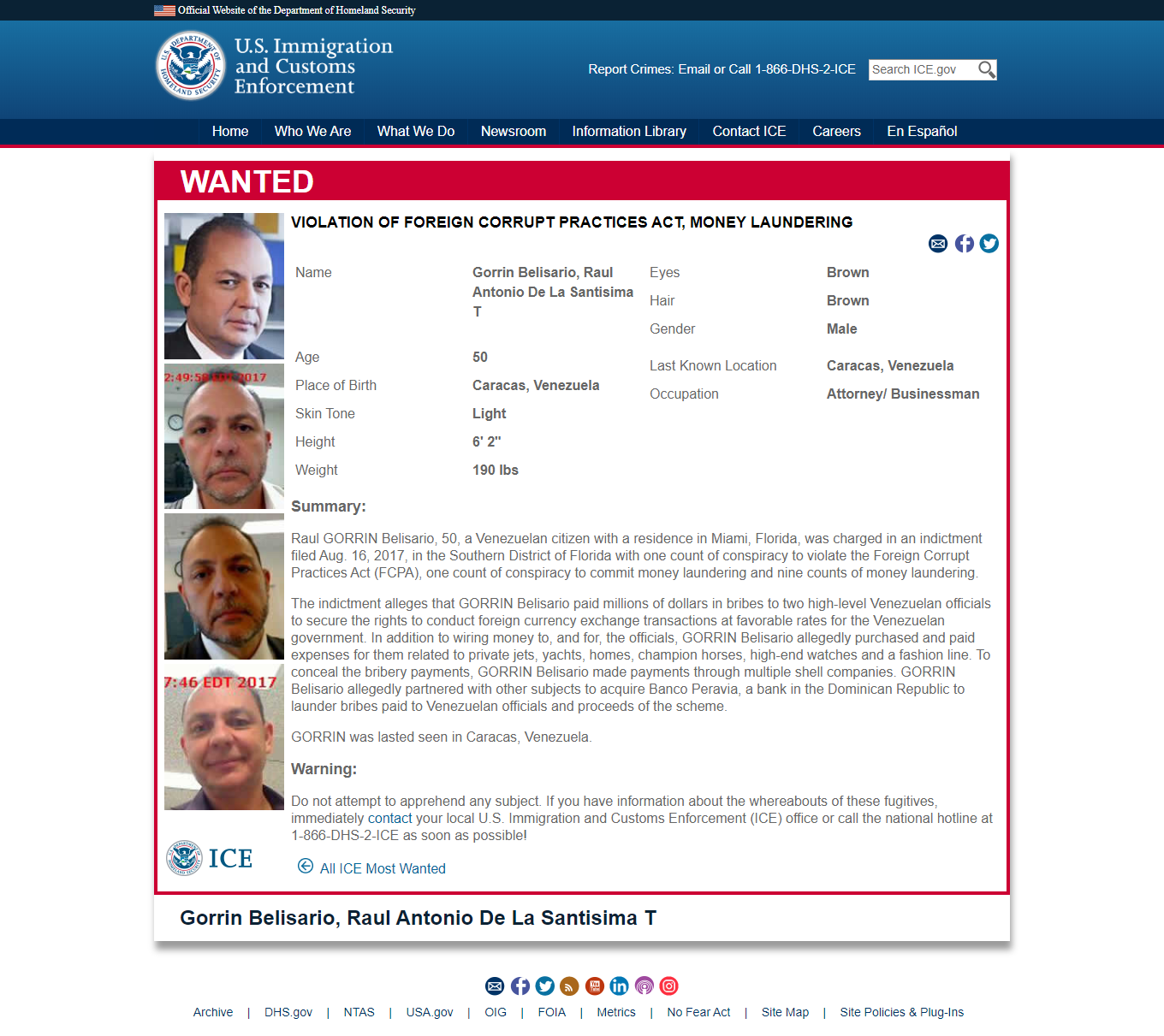 “La acusación alega que Gorrín Belisario pagó millones de dólares en sobornos a dos funcionarios venezolanos de alto nivel para garantizar los derechos de realizar transacciones de cambio de divisas a tasas favorables para el gobierno venezolano. Además de transferir dinero a, y para, los funcionarios, Gorrín Belisario supuestamente compró y pagó gastos relacionados con aviones privados, yates, casas, caballos campeones, relojes de alta gama y una línea de moda. Para ocultar los pagos de soborno, Gorrín Belisario realizó pagos a través de múltiples compañías fantasma. Gorrín Belisario supuestamente se asoció con otros sujetos para adquirir Banco Peravia, un banco en la República Dominicana para lavar sobornos pagados a funcionarios venezolanos y ganancias del esquema. Se le ha visto en Caracas, Venezuela”.