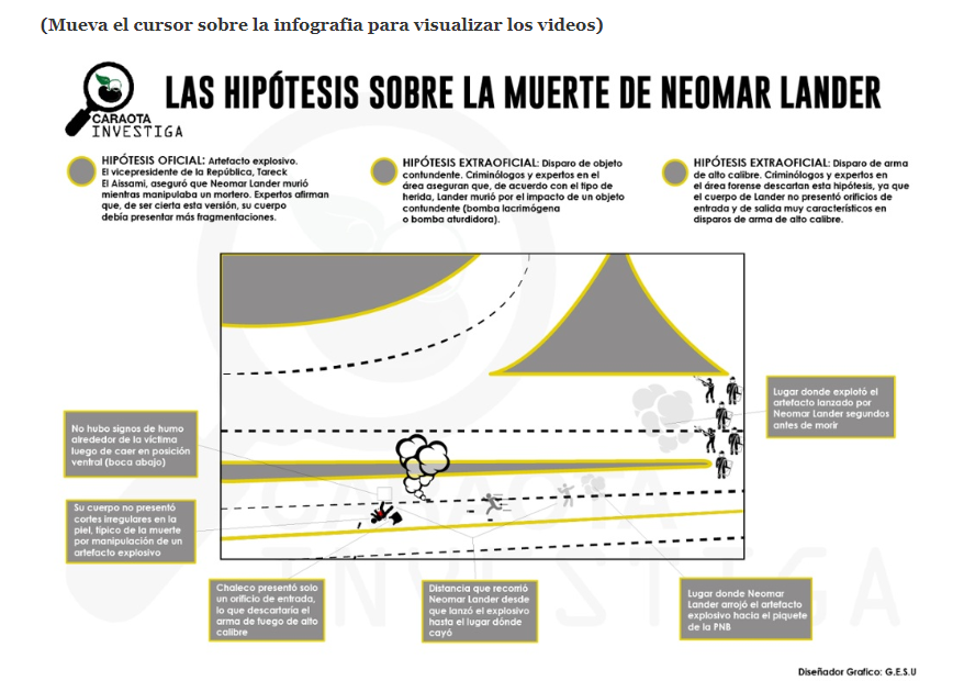 De acuerdo con el material audiovisual disponible en las redes sociales y recopilado por estos reporteros, el cuerpo de Neomar Lander cayó a metros de distancia del lugar donde accionó el artefacto explosivo. No existió alguna humareda alrededor de su cuerpo como resultado de una explosión de un artefacto, pero sí se observa -a pocos metros de su cuerpo- una bomba lacrimógena recién detonada.