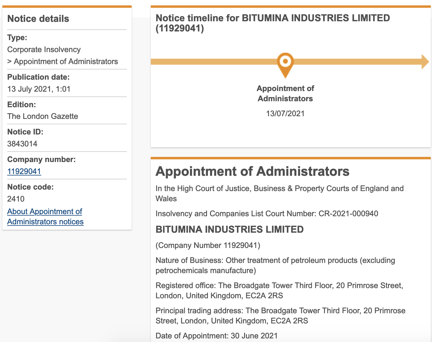 A few days ago a source informed this site that Bitumina Industries Limited had filed for bankruptcy in London. We tweeted about it and put the question to the London Gazette, which kindly came back today with corroboration. What this means is that Nynas largest shareholder (Bitumina’s 49.9%) is out of the game. The latest from Bitumina follows a “reorganisation” process over there in Sweden that was dodgy from all angles.